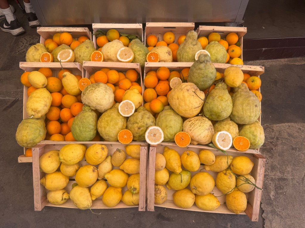 Citrus fruits at a market stall near Pompeii, Italy.